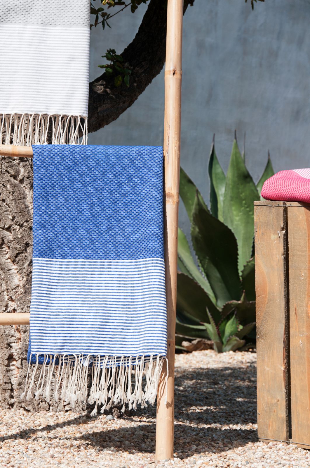 Hand-woven by craftsmen from southern Tunisia using 100% natural materials - the Hand-woven by craftsmen from southern Tunisia using 100% natural materials - the honeycomb "IBIZA" - Fouta is woven with a texture rather than a flat finish, reinforcing its absorption capacity and softness to the touch. Elegant, light and easy to maintain, its wide range of colors and the quality of its weaving allow many different uses. In addition to being the versatile accessory of our summers; beach or bath towels, pareo, scarves, stoles, it has become the essential object of decoration of our interiors and exteriors; draped on the back of a chair, neatly folded at the end of the bed .... it instantly brings chic and elegance to your home.