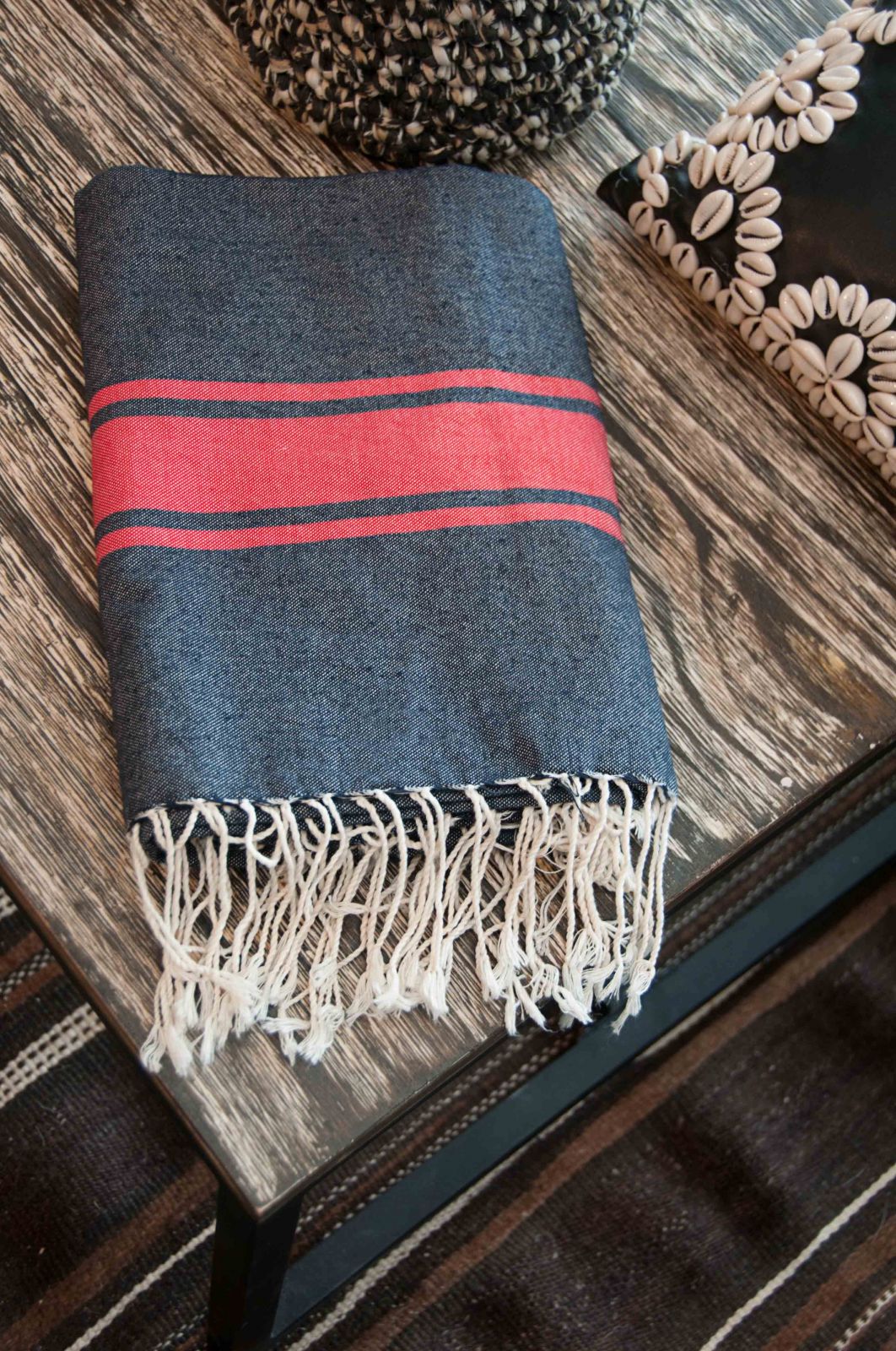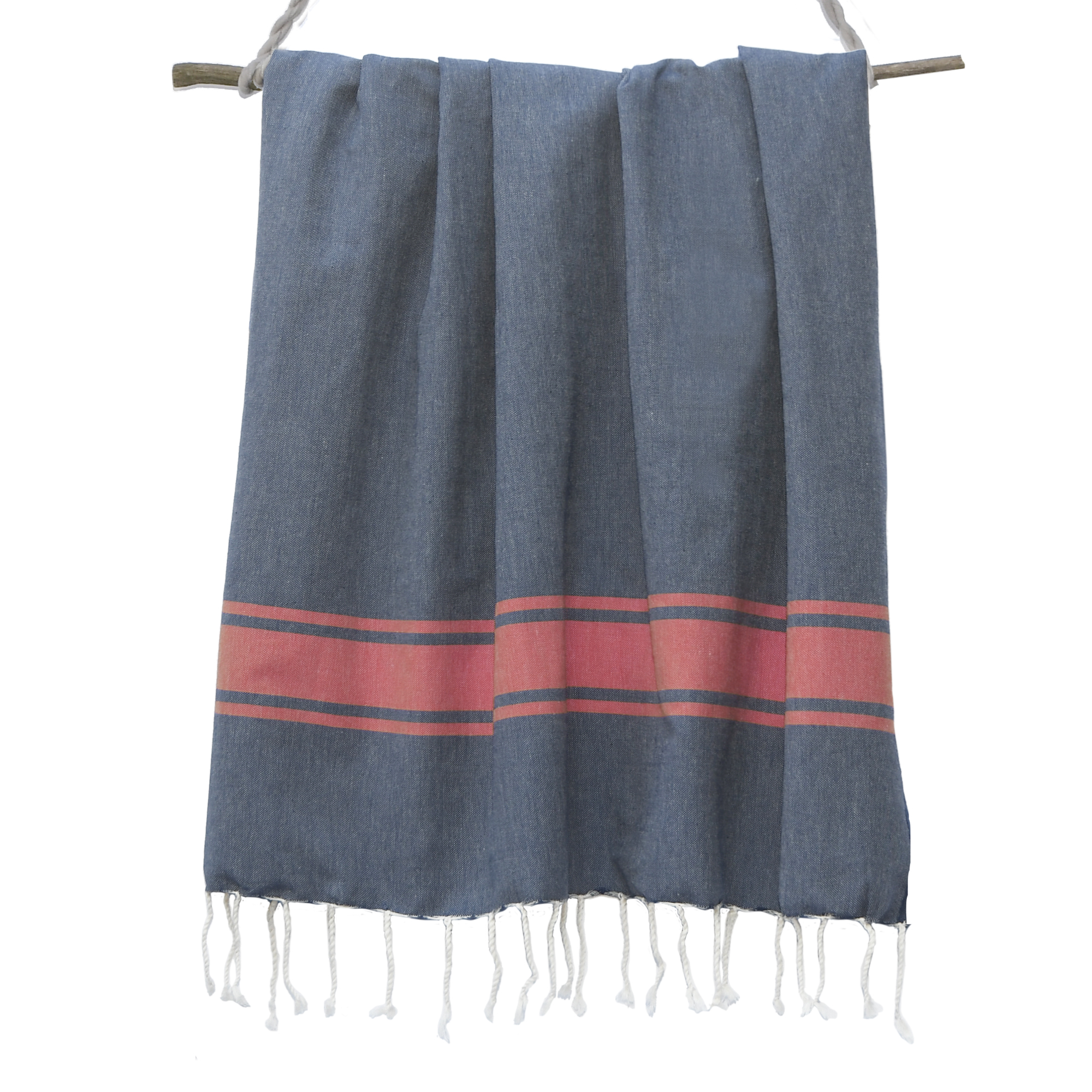 Titre : Fouta Traditionelle Bi-color St Tropez Bleu Jean - Rayure Classique - Rouge