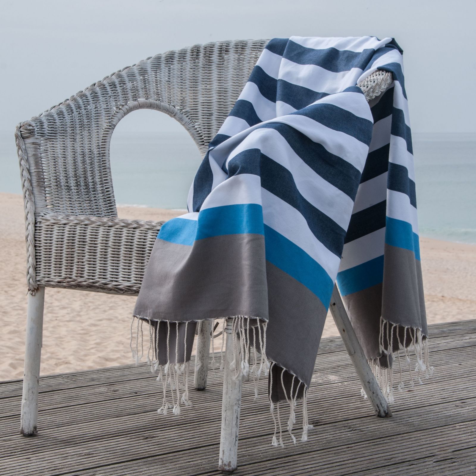 Titre : Fouta Arcachon Taupe Clair / Blanc / Bleu Jean / Bleu Azur