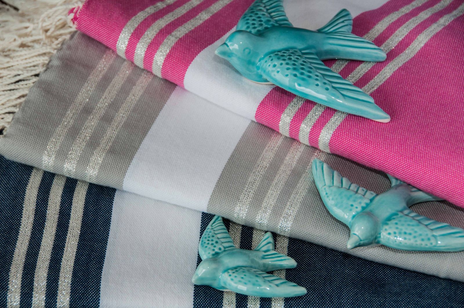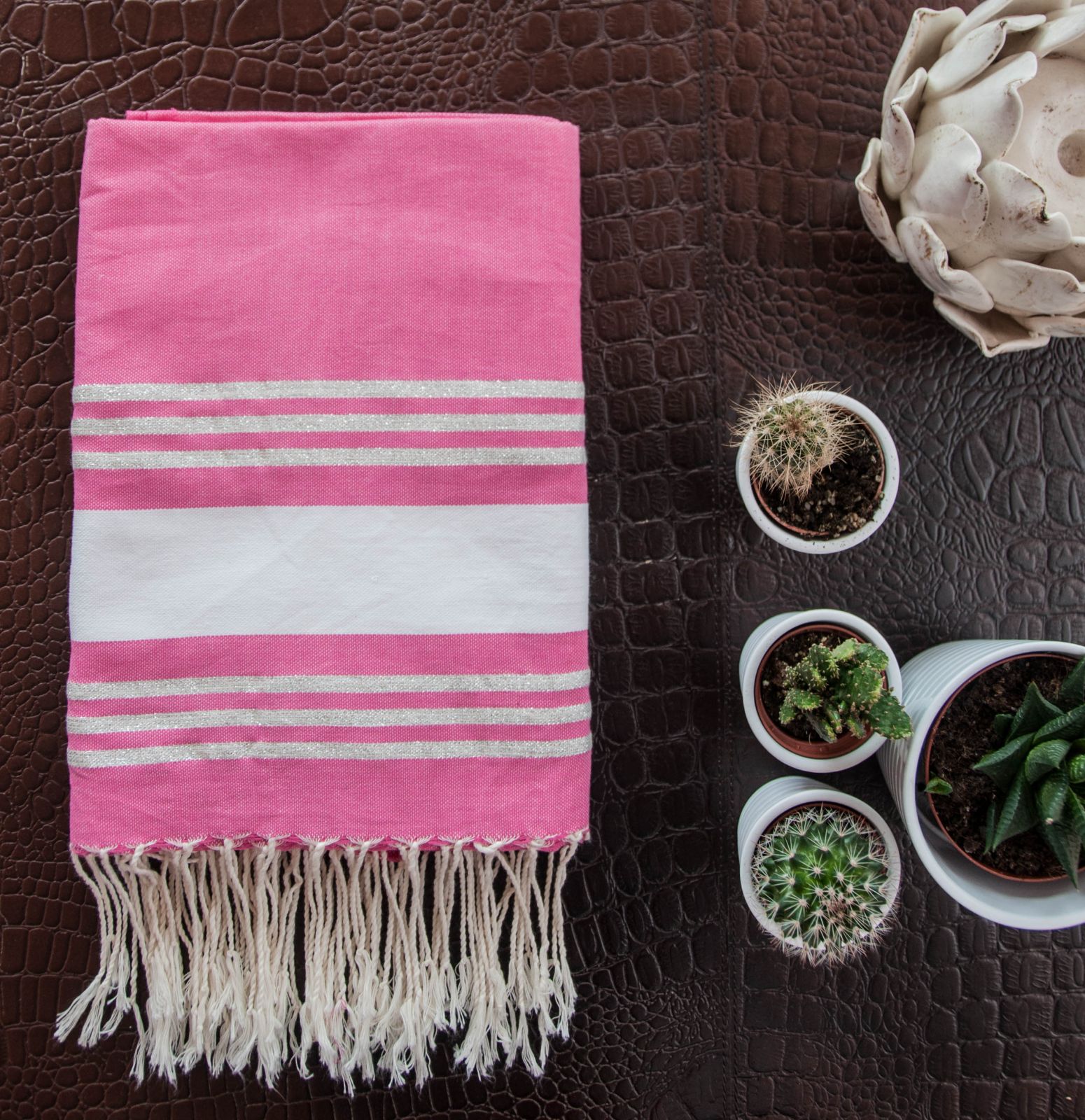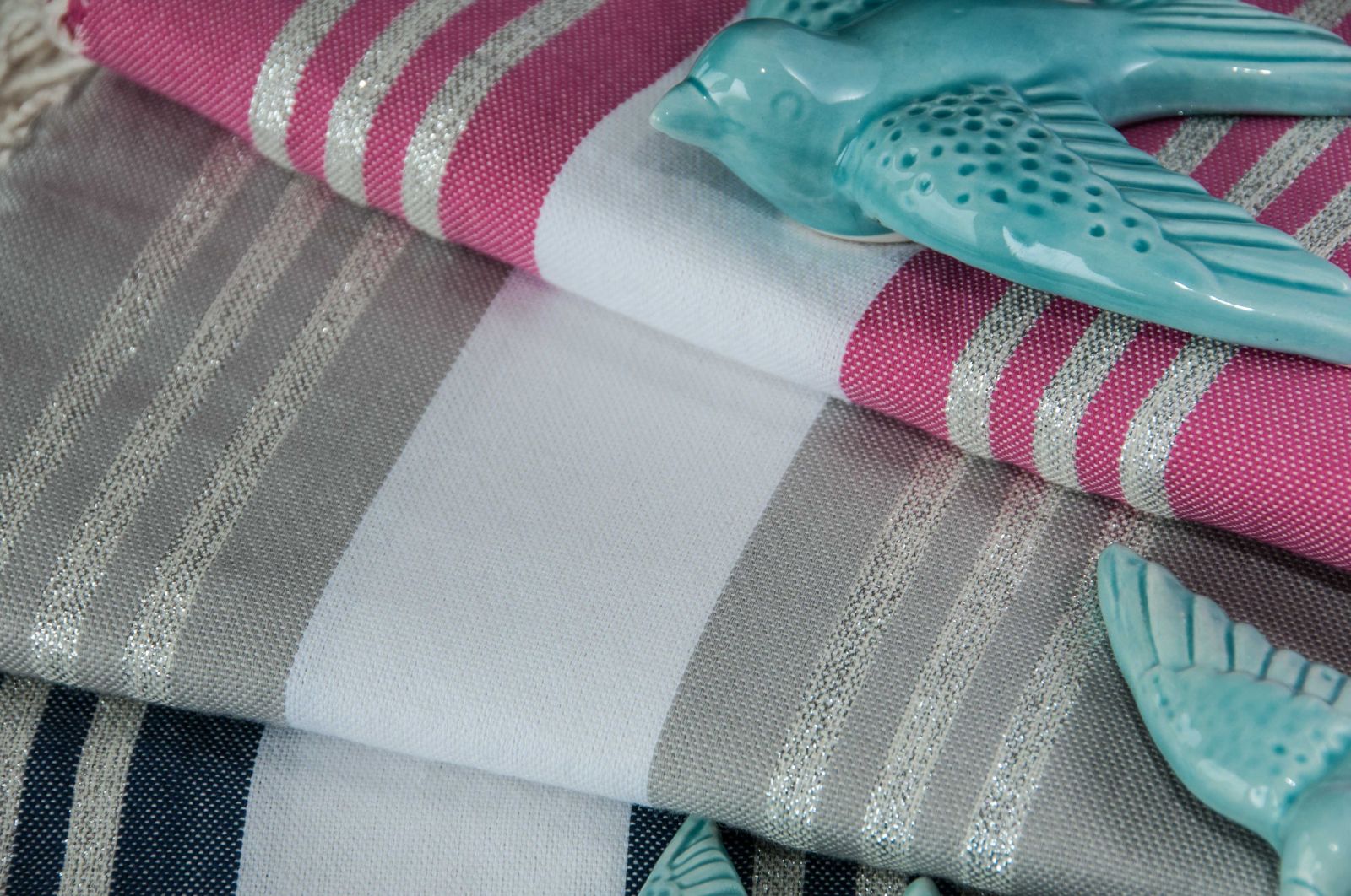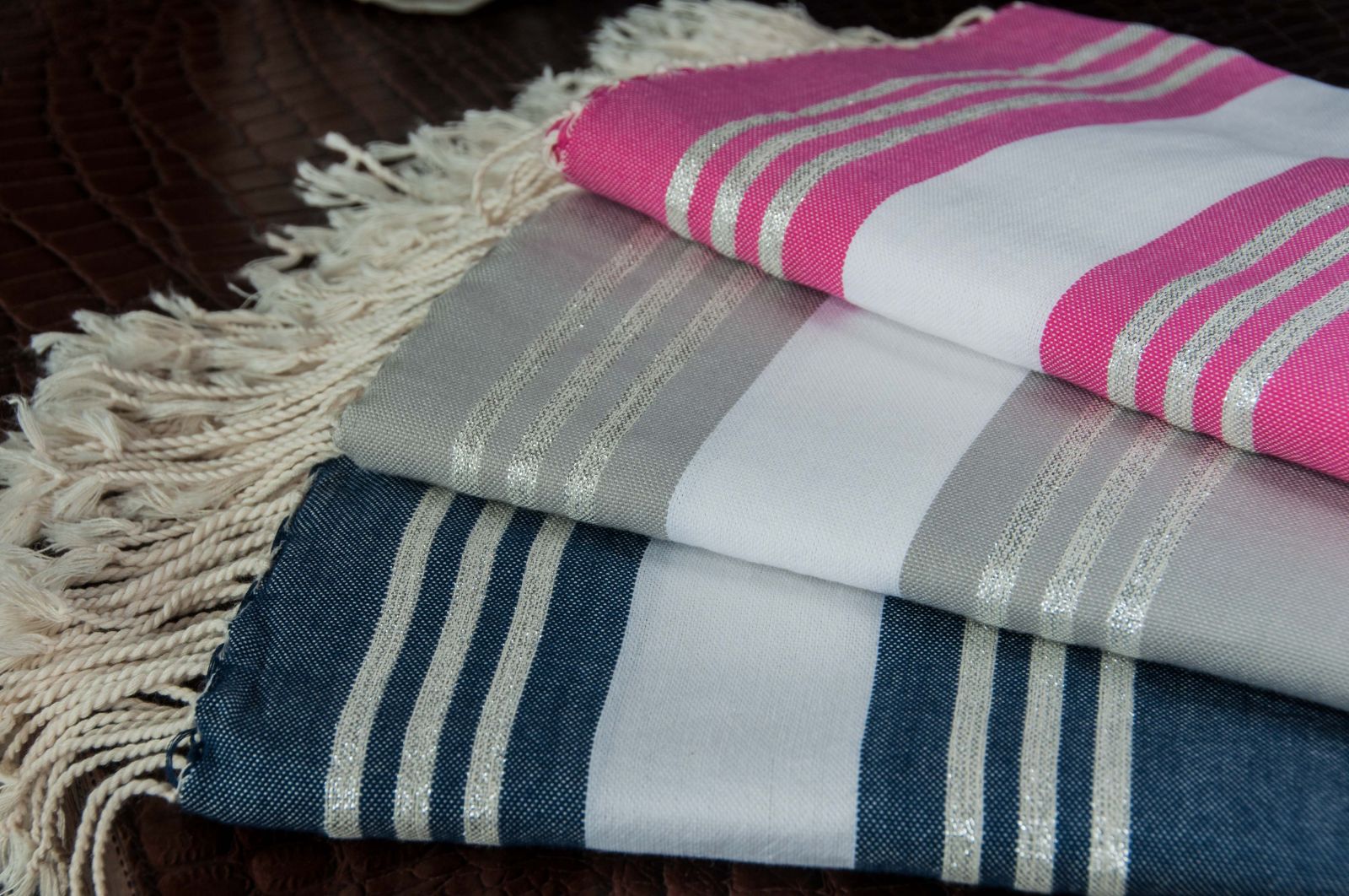 Hand-woven by artisans in southern Tunisia using 100% natural materials, - the Fouta Lurex "SAINT BARTH" combines lightness with incredible absorbency. Light and easy to maintain, its wide range of colors and the quality of its weaving allow many different uses. In addition to being the versatile accessory of our summers; beach towel, pareo, scarves, stoles, it has become the essential object of decoration of our interiors and outer, draped over the back of a chair, neatly folded at the end of bed .... it brings instantly chic and elegance to your interior.