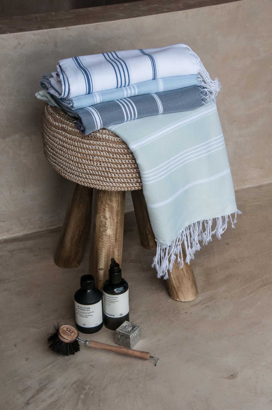 Hand-woven by artisans from southern Tunisia using 100% natural materials, the fouta "MYKONOS" - Traditionally used for centuries, in Turkish baths, combines lightness with absorption capacity. Elegant, light and easy to maintain, its wide range of colors and the quality of its weaving allow it a declination under different uses. In addition to being the versatile accessory of our summers; beach or bath towels, pareo, scarves, stoles, it has become the essential object of decoration of our interiors and exteriors; draped on the back of a chair, neatly folded at the end of the bed .... it instantly brings chic and elegance to your home.\n