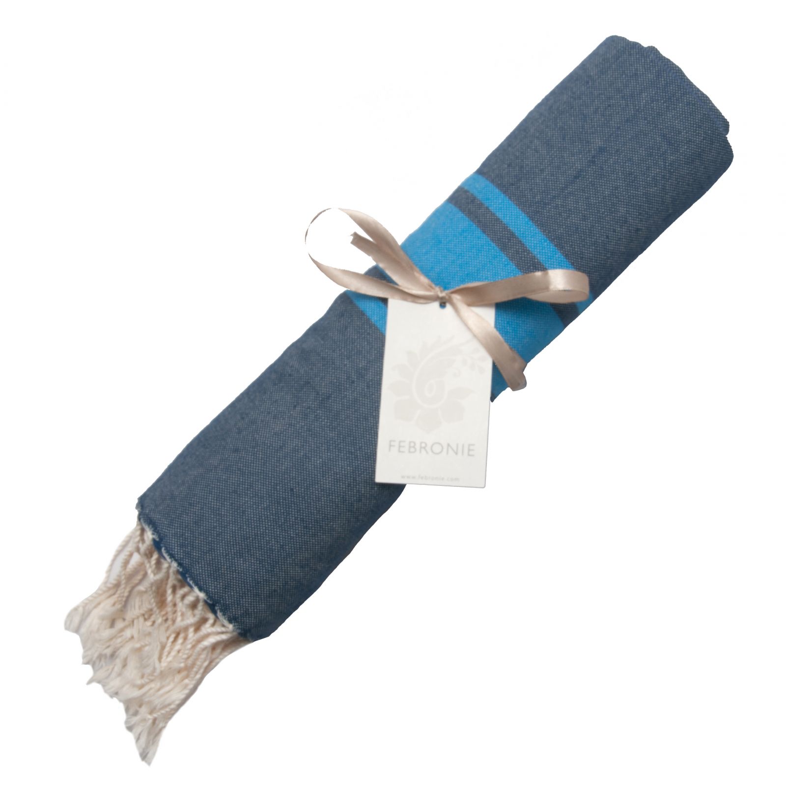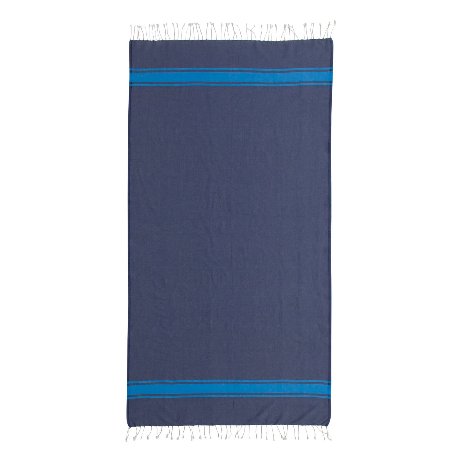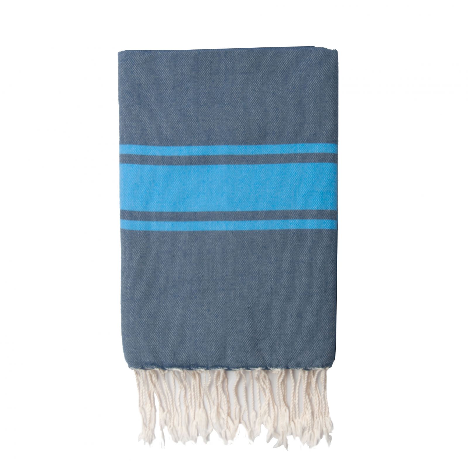 Titre : Fouta Traditionelle Bi-color St Tropez Bleu Jean - Rayure Classique - Bleu Azur