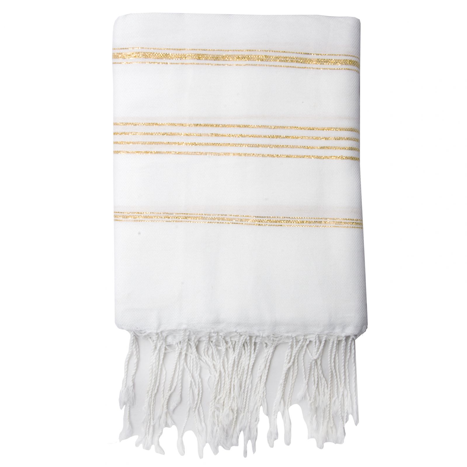 Hand-woven by artisans from southern Tunisia using 100% natural materials, the lurex fouta "MYKONOS" - Traditionally used for centuries, in Turkish baths, combines lightness with absorption capacity. Elegant, light and easy to maintain, its wide range of colors, lurex stripes and the quality of its weaving allow it a declination under different uses. In addition to being the versatile accessory of our summers; beach or bath towels, pareo, scarves, stoles, it has become the essential object of decoration of our interiors and exteriors; draped on the back of a chair, neatly folded at the end of the bed .... it instantly brings chic and elegance to your home.\n
