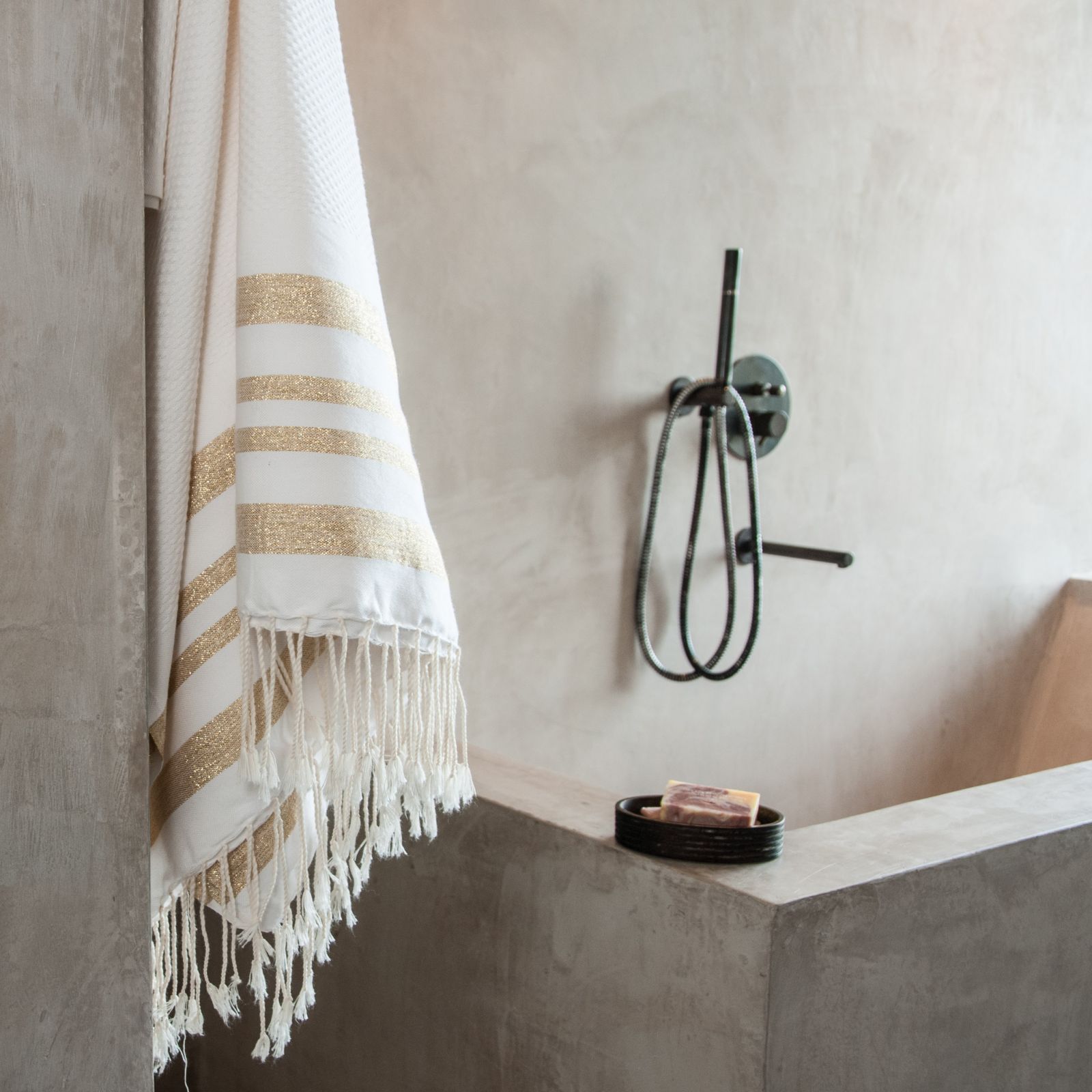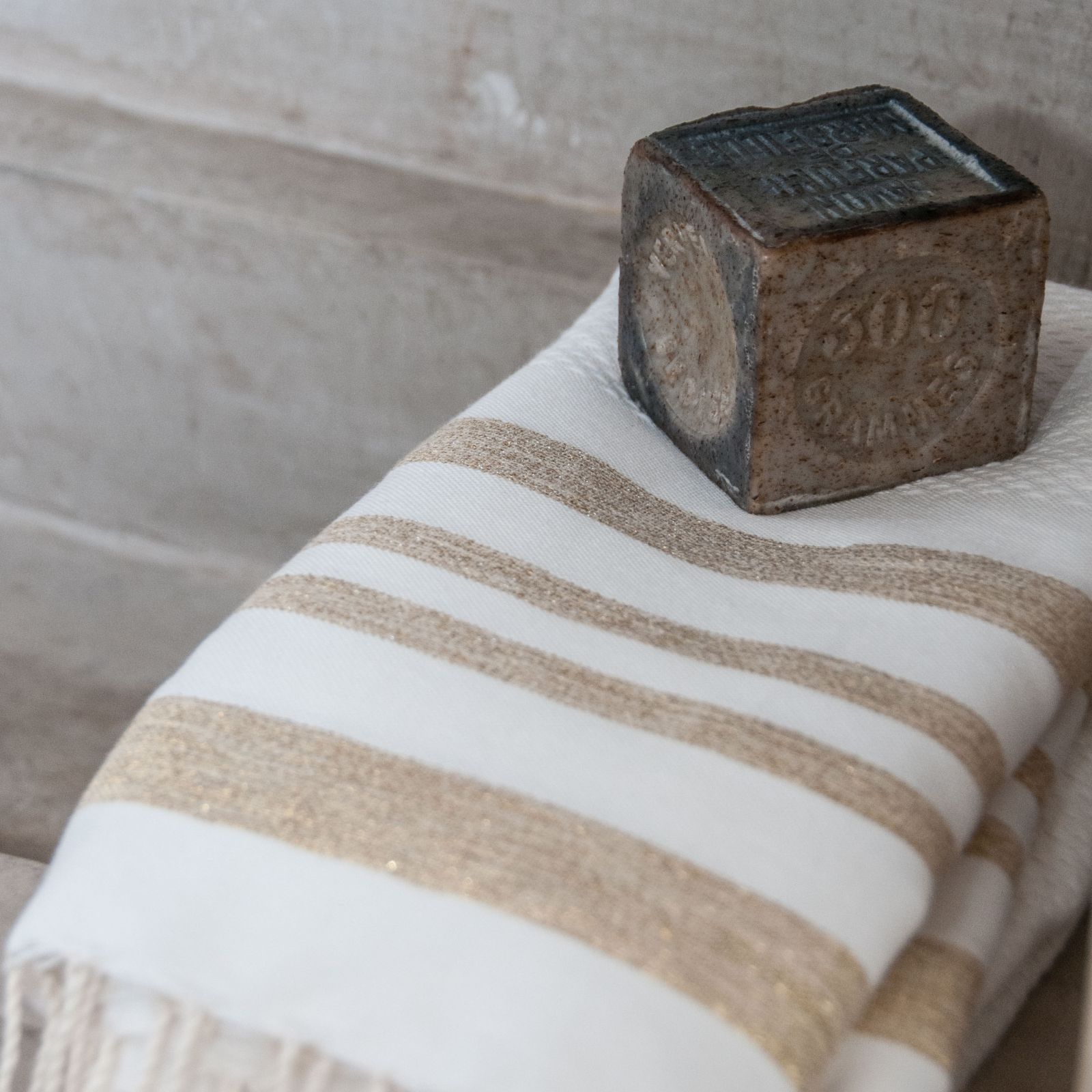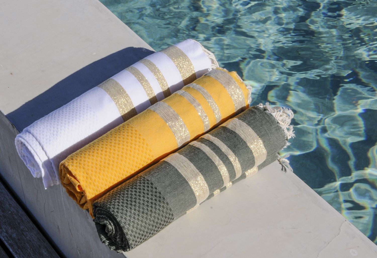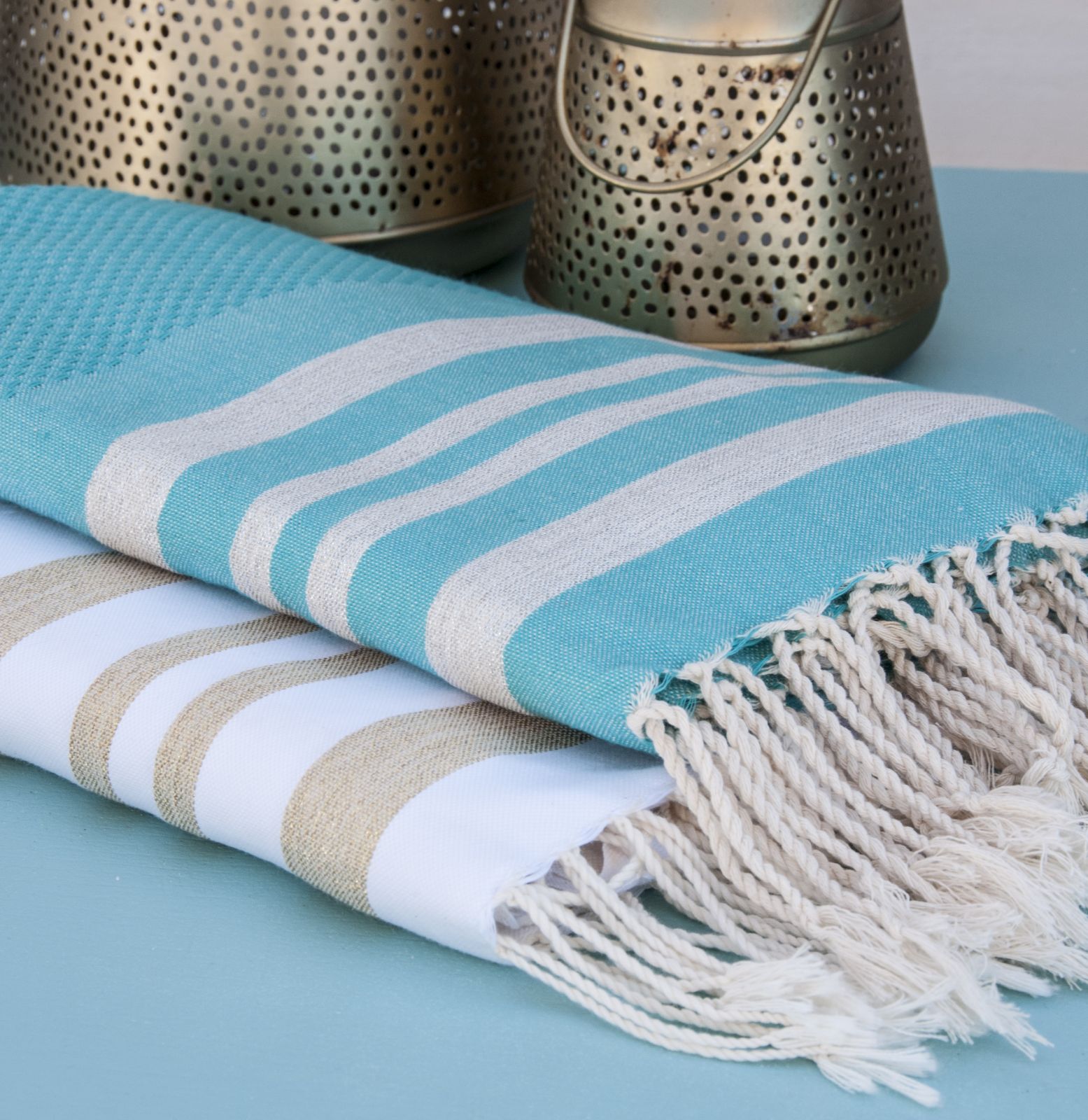 Hand-woven by craftsmen from southern Tunisia using 100% natural materials - the Hand-woven by craftsmen from southern Tunisia using 100% natural materials - the honeycomb Lurex "HAMPTONS" - Fouta is woven with a texture rather than a flat finish, reinforcing its absorption capacity and softness to the touch. Elegant, light and easy to maintain, its wide range of colors, its lurex stripes and the quality of its weaving allow many different uses. In addition to being the versatile accessory of our summers; beach or bath towels, pareo, scarves, stoles, it has become the essential object of decoration of our interiors and exteriors; draped on the back of a chair, neatly folded at the end of the bed .... it instantly brings chic and elegance to your home.