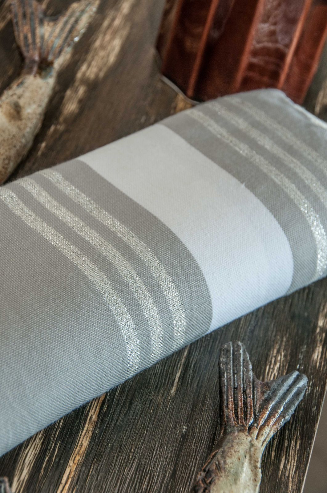 Description : Tissée main par des artisans du sud de la Tunisie utilisant des matériaux 100 % naturels, – la Fouta Lurex "SAINT BARTH – allie légèreté à une incroyable capacité d’absorption. Légère et facile d´entretien, sa gamme de couleur et sa bande lurex argentée apporte élegance et raffinement et lui permettent une déclinaison sous différents usages. En plus d´être l´accessoire par excellence de nos étés; serviettes de plage ou de salle de bain, paréo, foulards, étoles, elle est devenue l´objet incontournable de décoration de nos intérieurs et extérieurs; drapée sur le dos d’une chaise, soigneusement pliée en bout de lit....elle apporte instantanément du chic et de l’élégance à votre intérieur.