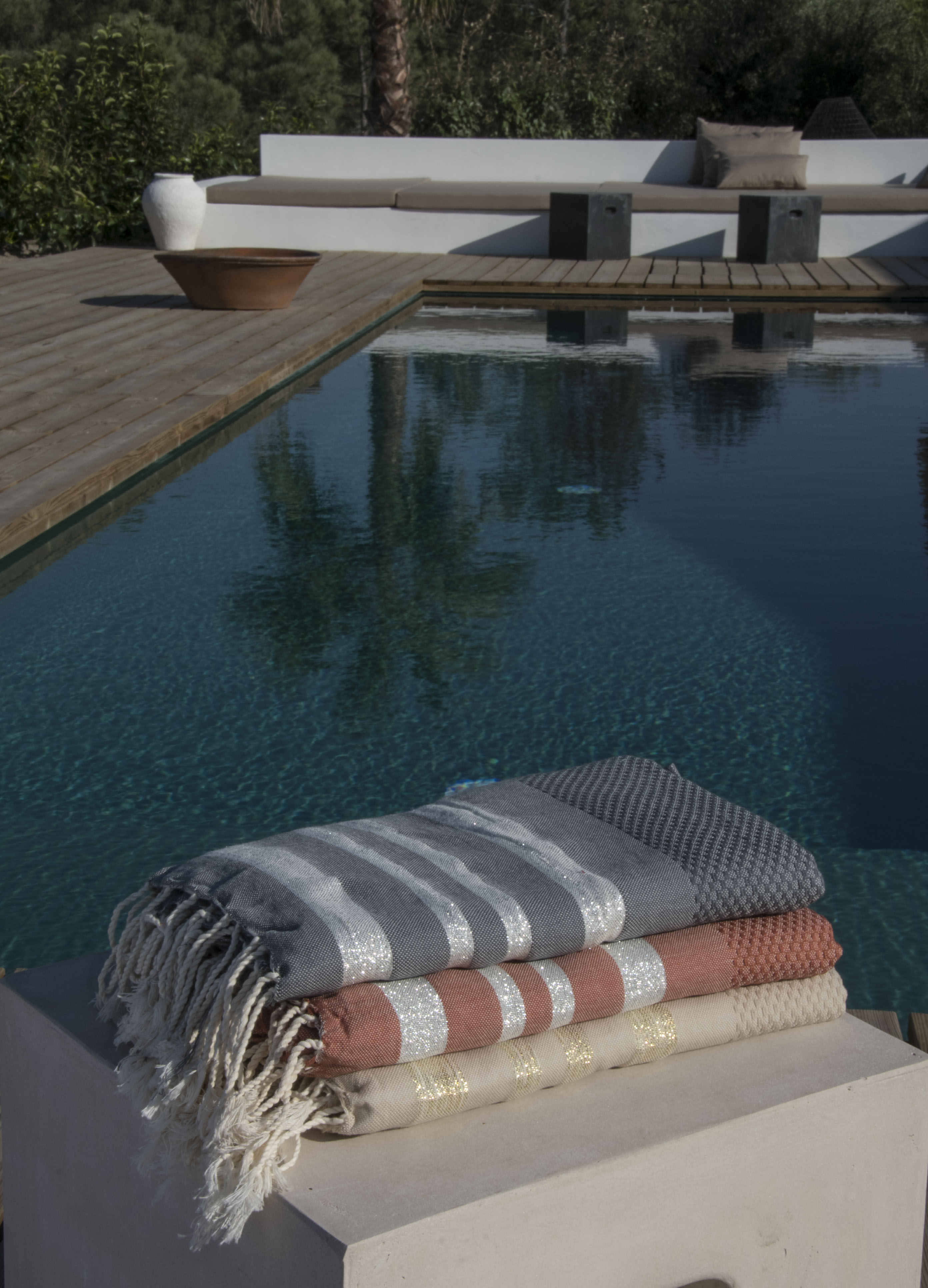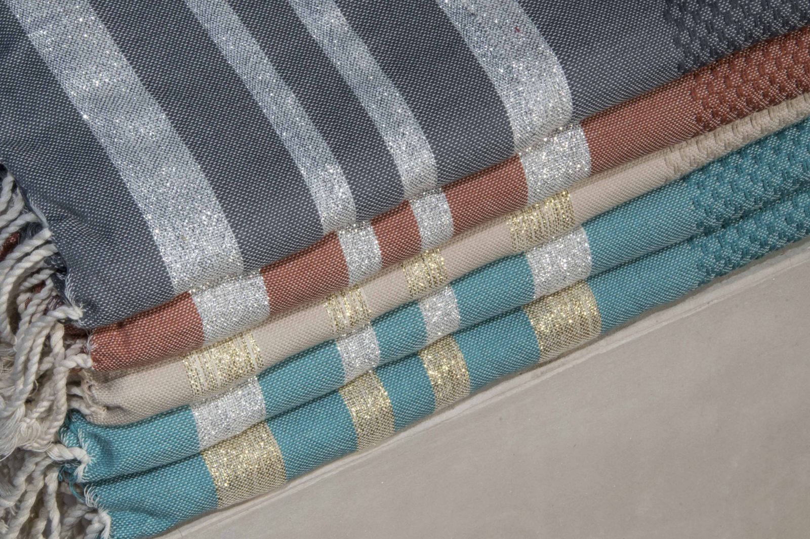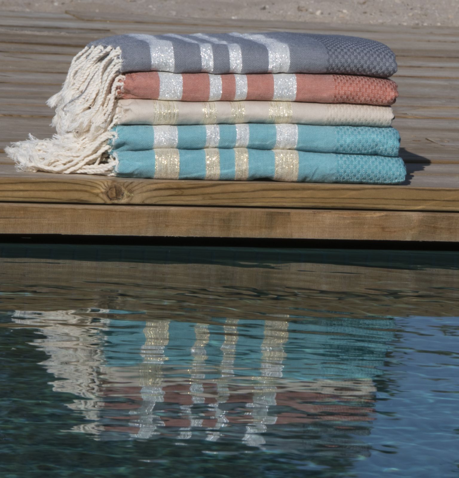 Hand-woven by craftsmen from southern Tunisia using 100% natural materials - the Hand-woven by craftsmen from southern Tunisia using 100% natural materials - the honeycomb Lurex "HAMPTONS" - Fouta is woven with a texture rather than a flat finish, reinforcing its absorption capacity and softness to the touch. Elegant, light and easy to maintain, its wide range of colors, its lurex stripes and the quality of its weaving allow many different uses. In addition to being the versatile accessory of our summers; beach or bath towels, pareo, scarves, stoles, it has become the essential object of decoration of our interiors and exteriors; draped on the back of a chair, neatly folded at the end of the bed .... it instantly brings chic and elegance to your home.