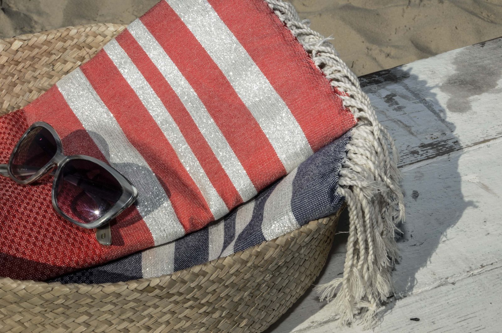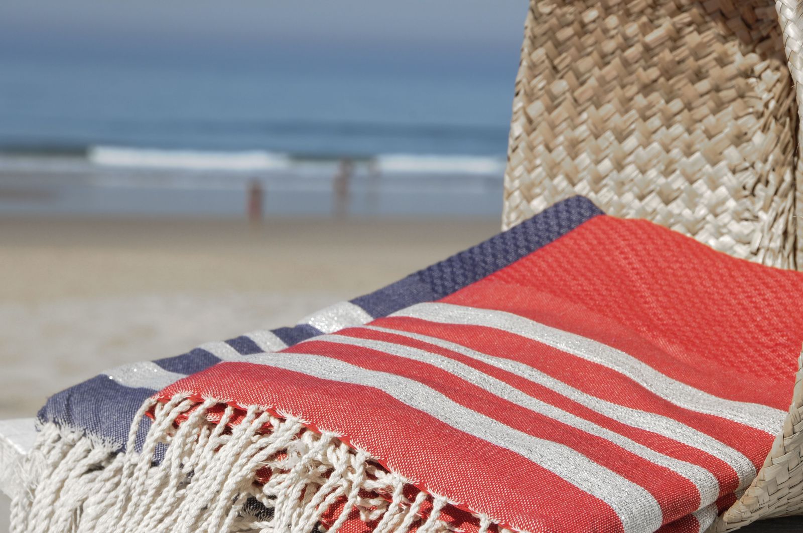 Hand-woven by craftsmen from southern Tunisia using 100% natural materials - the Hand-woven by craftsmen from southern Tunisia using 100% natural materials - the honeycomb Lurex "HAMPTONS" - Fouta is woven with a texture rather than a flat finish, reinforcing its absorption capacity and softness to the touch. Elegant, light and easy to maintain, its wide range of colors, its lurex stripes and the quality of its weaving allow many different uses. In addition to being the versatile accessory of our summers; beach or bath towels, pareo, scarves, stoles, it has become the essential object of decoration of our interiors and exteriors; draped on the back of a chair, neatly folded at the end of the bed .... it instantly brings chic and elegance to your home.