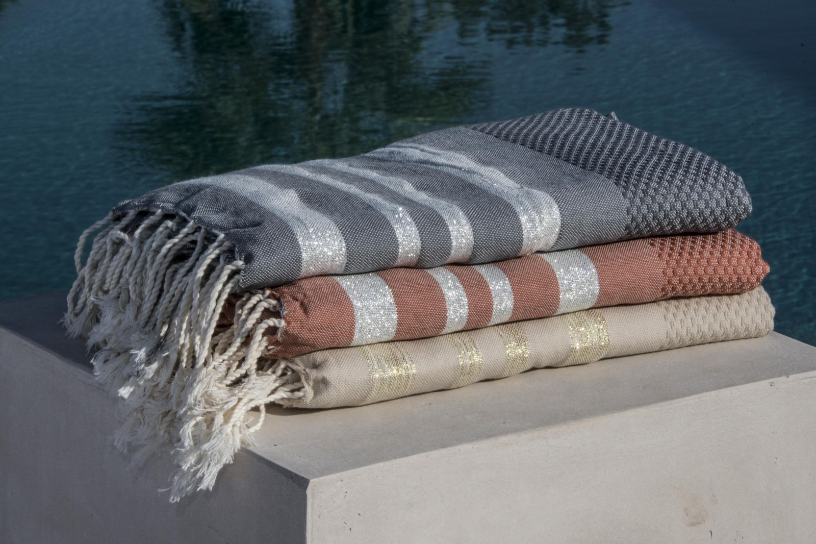 Hand-woven by craftsmen from southern Tunisia using 100% natural materials - the Hand-woven by craftsmen from southern Tunisia using 100% natural materials - the honeycomb Lurex "HAMPTONS" - Fouta is woven with a texture rather than a flat finish, reinforcing its absorption capacity and softness to the touch. Elegant, light and easy to maintain, its wide range of colors, its lurex stripes and the quality of its weaving allow many different uses. In addition to being the versatile accessory of our summers; beach or bath towels, pareo, scarves, stoles, it has become the essential object of decoration of our interiors and exteriors; draped on the back of a chair, neatly folded at the end of the bed .... it instantly brings chic and elegance to your home.