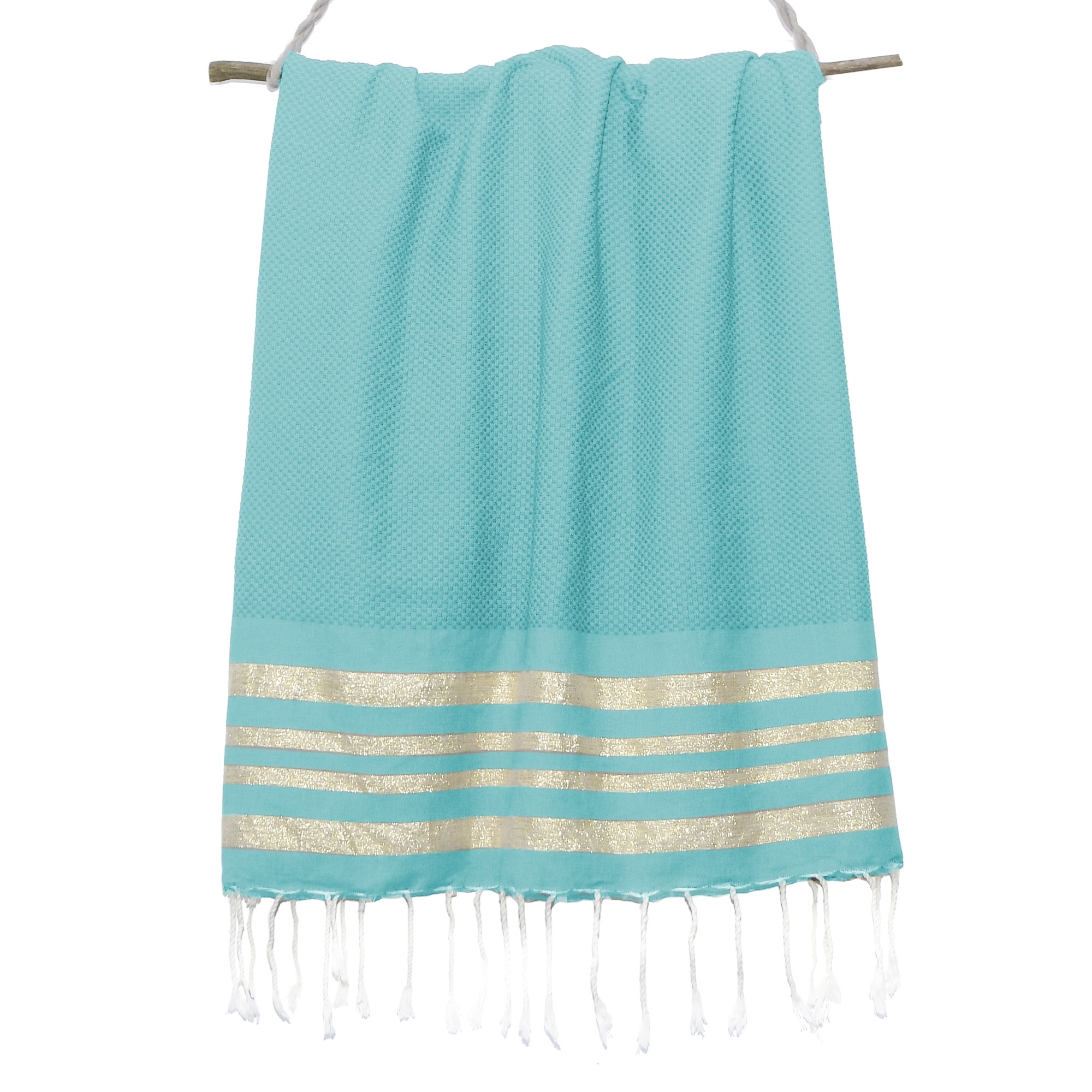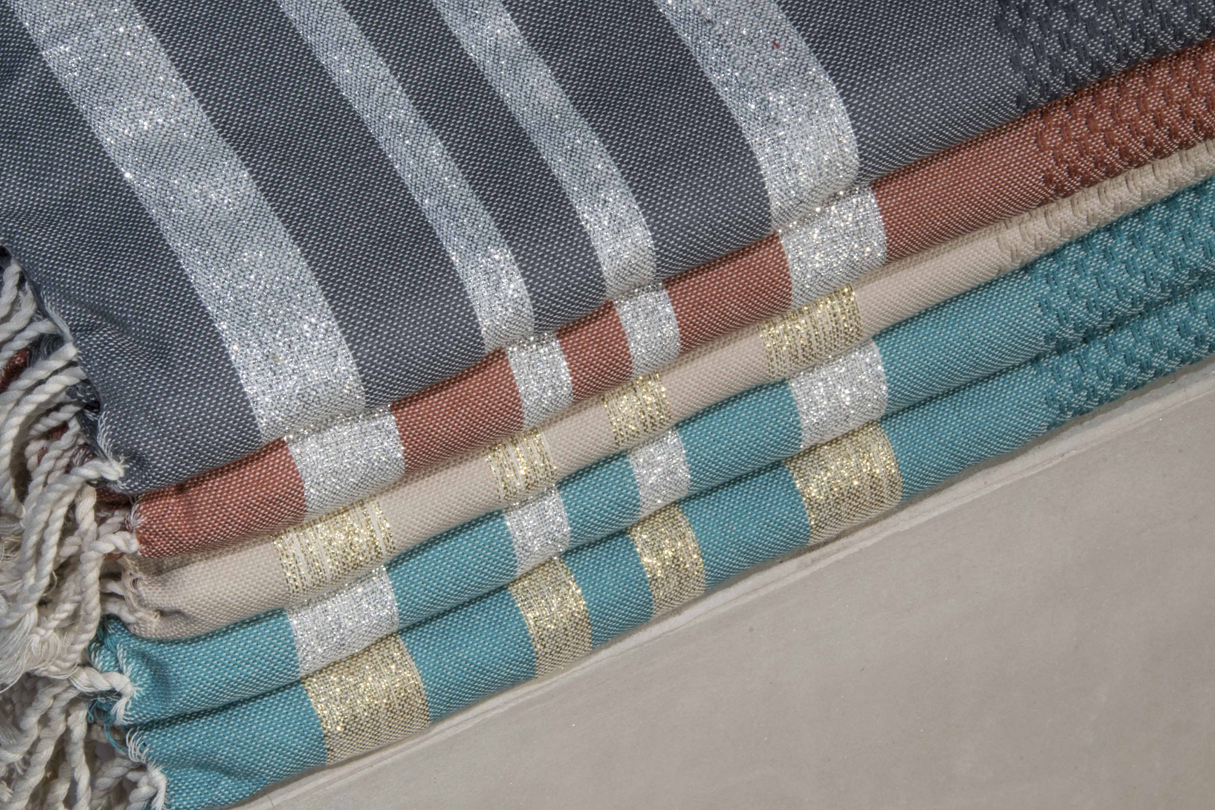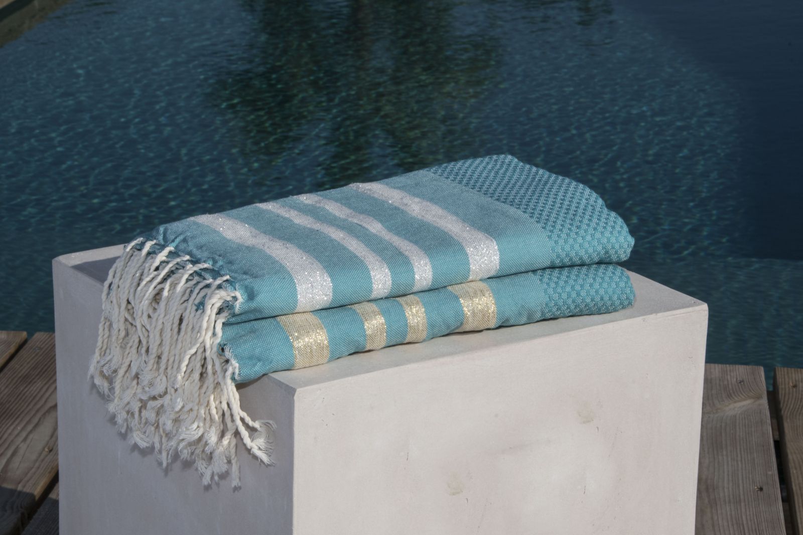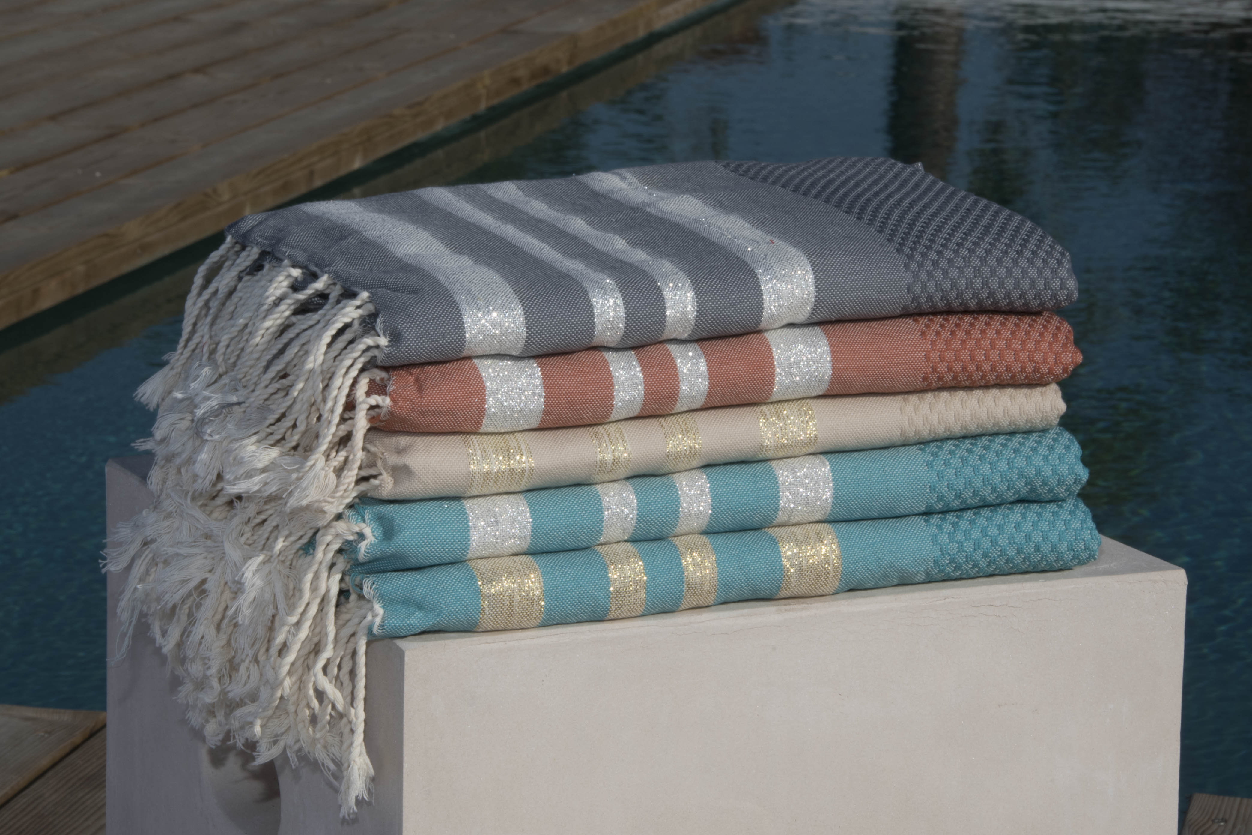 Hand-woven by craftsmen from southern Tunisia using 100% natural materials - the Hand-woven by craftsmen from southern Tunisia using 100% natural materials - the honeycomb Lurex "HAMPTONS" - Fouta is woven with a texture rather than a flat finish, reinforcing its absorption capacity and softness to the touch. Elegant, light and easy to maintain, its wide range of colors, its lurex stripes and the quality of its weaving allow many different uses. In addition to being the versatile accessory of our summers; beach or bath towels, pareo, scarves, stoles, it has become the essential object of decoration of our interiors and exteriors; draped on the back of a chair, neatly folded at the end of the bed .... it instantly brings chic and elegance to your home.