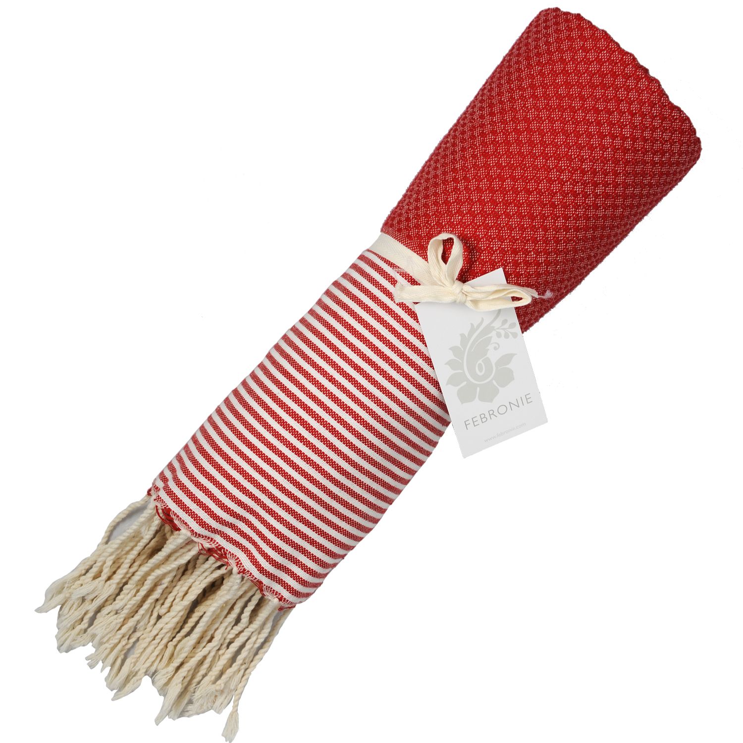 Titre : Fouta Nid d'abeille Ibiza - Rayure fine - Rouge_AirFrance