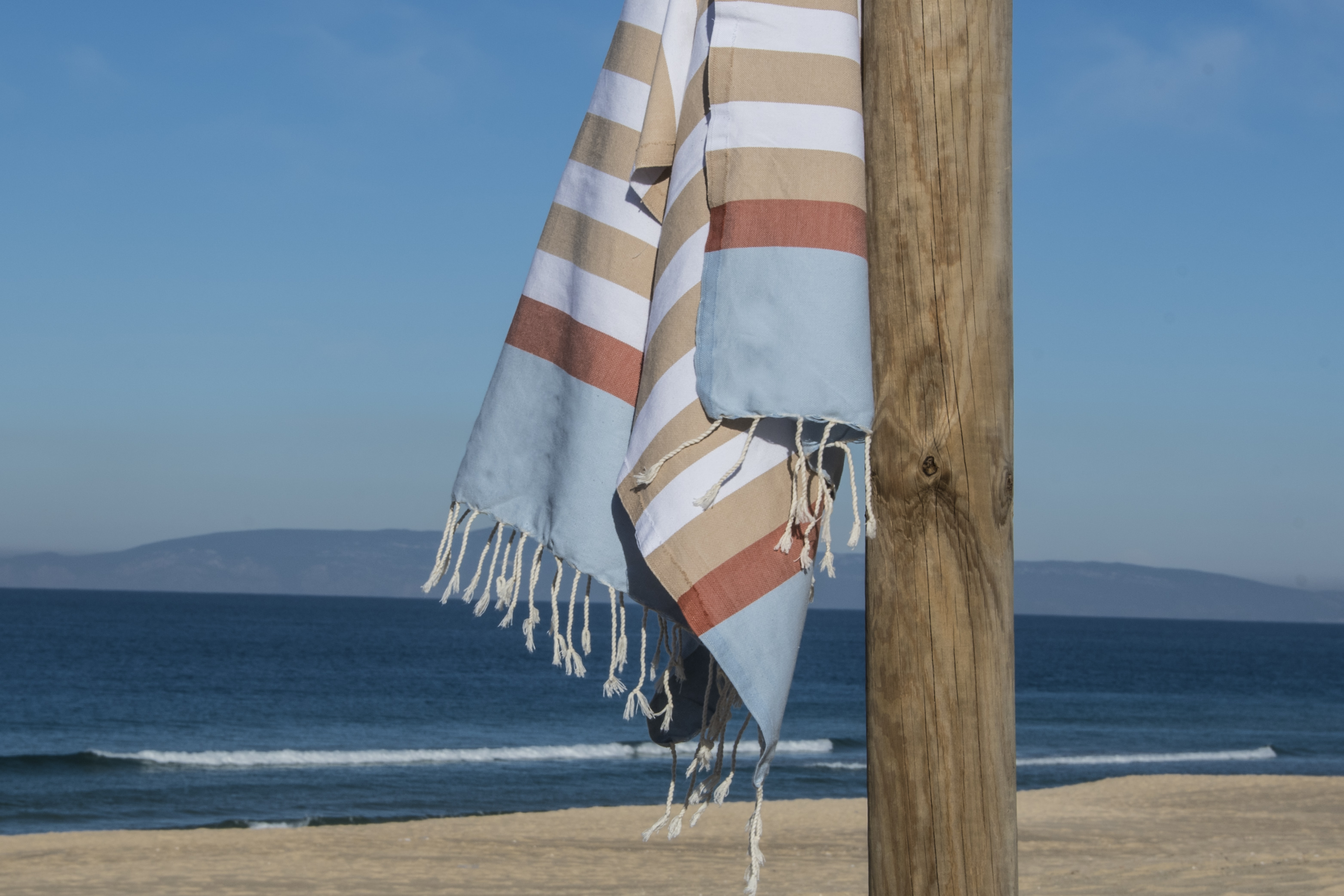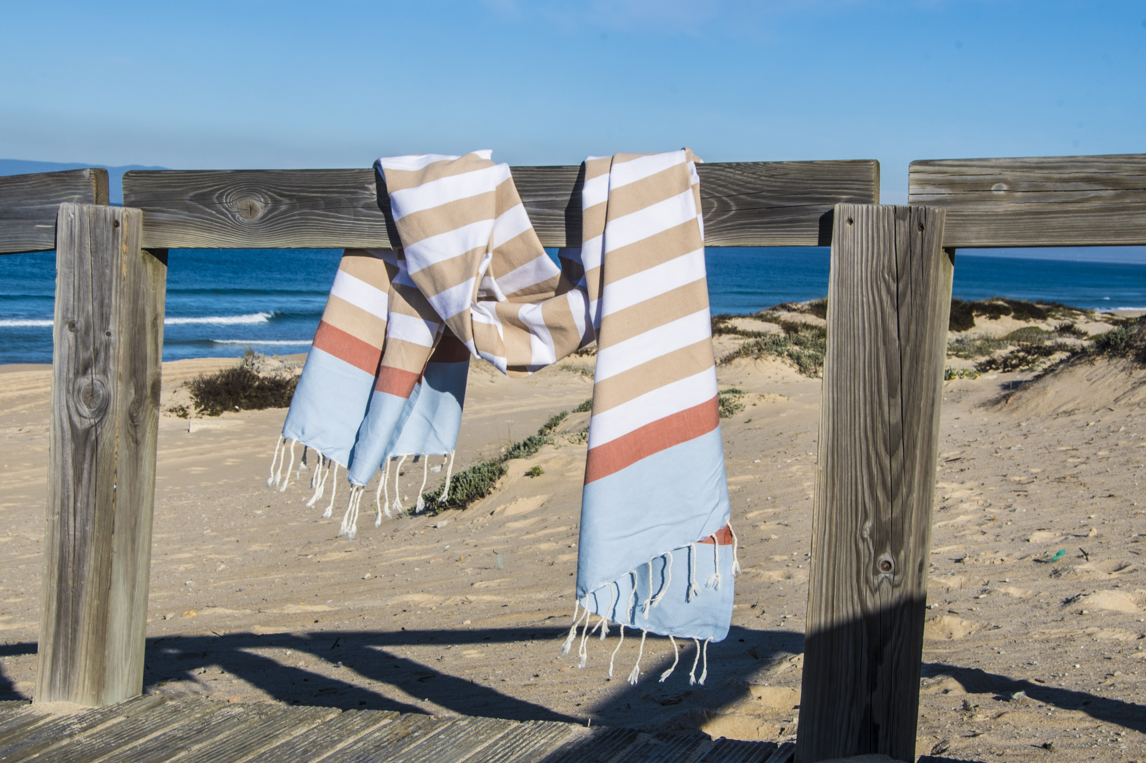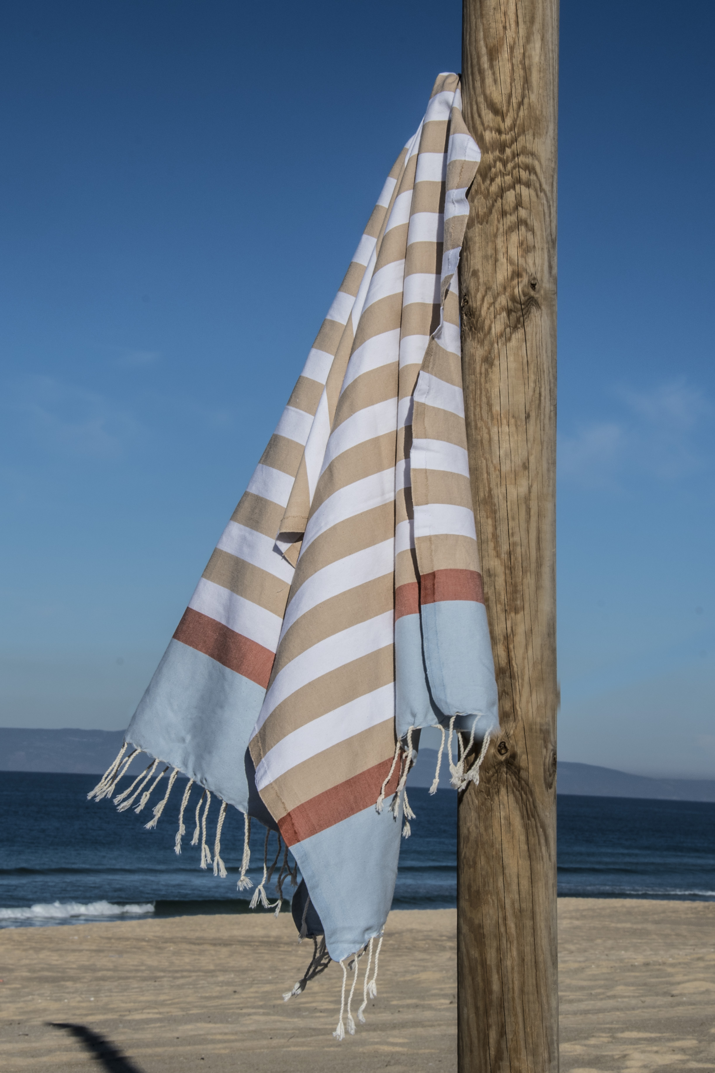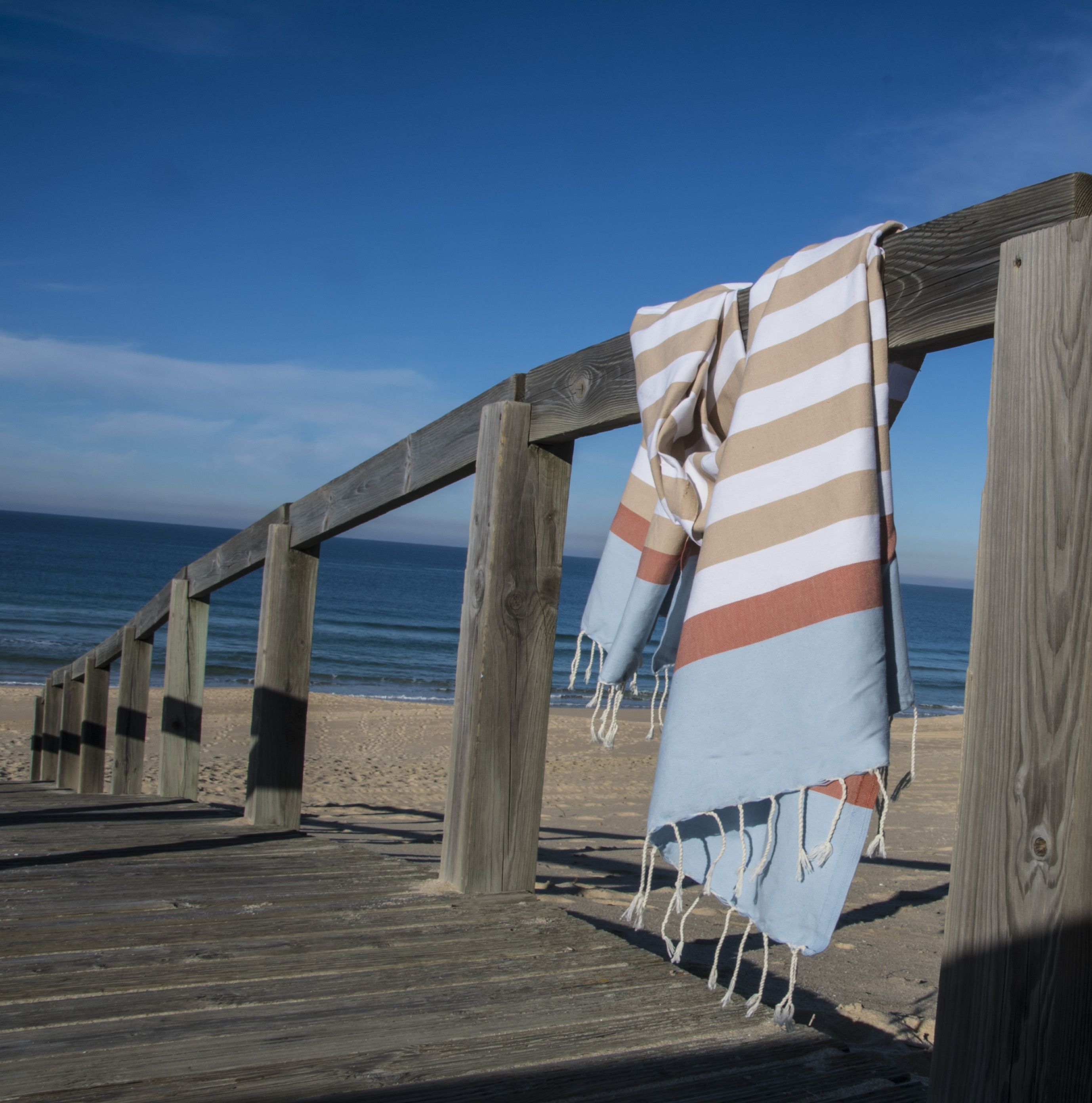Titre : Fouta Arcachon Beige / Blanc / Terracotta / Bleu Ciel